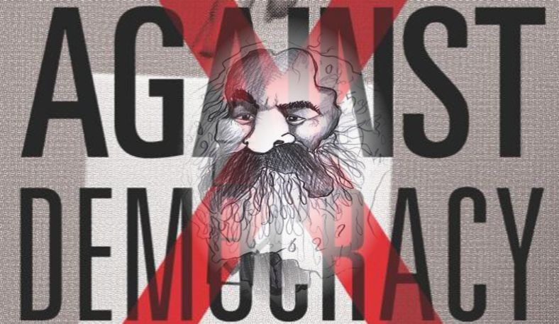 دید مارکس در ضدیت تام با دموکراسی مالوف جوامع آزاد غربی قرار داشته،او همیشه در تحقیر و رد پارلمان و مظاهر دموکراسی تلاش می کرد؛تمام این سازوکار مدرنیتۀ سیاسی در دید او زیر لفظ “بورژوایی”محکوم به نابودی و غیر قابل دفاع بود.