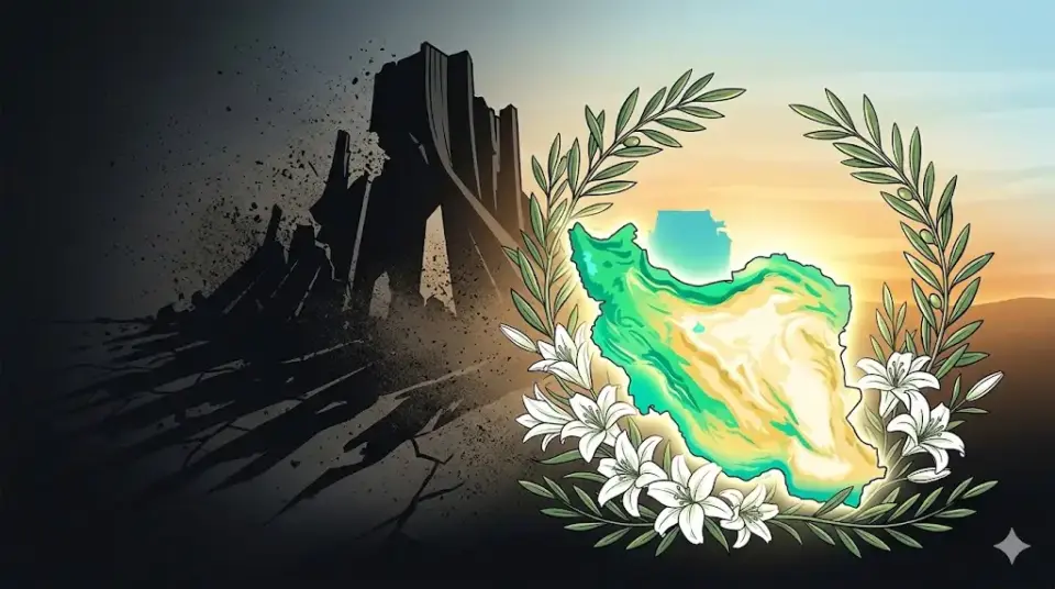 یک تصویرسازی افقی مفهومی توسط هوش مصنوعی. در پس‌زمینه، سایه‌های یک سازه‌ی سرکوبگر در حال فروپاشی و تبدیل شدن به غبار هستند. در پیش‌زمینه، نقشه‌ای پر جنب و جوش و درخشان از ایران دوباره متولد شده است که با نیلوفرهای سفید و شاخه‌های زیتون احاطه شده است.
