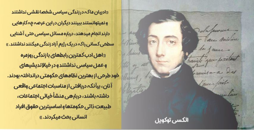 «اهل ادب کمترین رابطهای با زندگی روزمره و عمل سیاسی نداشتند و در خیالاندیشیهای خود طرحی از بهترین نظامهای حکومتی درانداخته بودند. آنان، بیآنکه دریافتی از مناسبات اجتماعی واقعی داشته باشند، دربارهی منشأ خیالی اجتماعات، طبیعت ذاتی حکومتها و اساسیترین حقوق افراد انسانی بحث میکردند.»