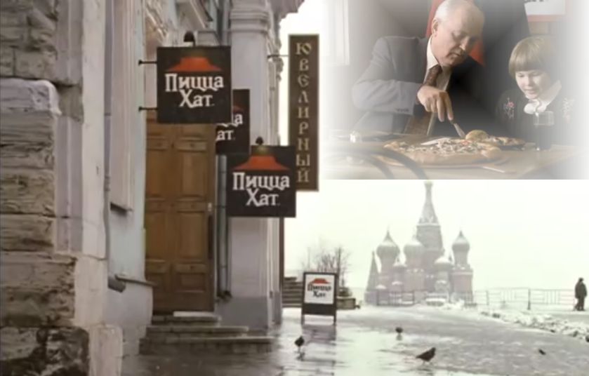 تبلیغ با تصویری از بالا آغاز میشود که کلیسای جامع مسیحِ منجی و میدان مانژنایا (Manezhnaya) در آن دیده میشود. برف تازهای زمین را سپیدپوش کرده است. گورباچف چتر در دست با نوهاش آناستازیا از میدان میگذرد، در حالی که کلیسای جامع سنت باسیل ــ که مانند کرملین یکی از نمادهای اصلی مسکوست ــ در تصویر پیداست. در میدان سرخ، همانجایی که به مدت هفت دهه جولانگاه ارتش سرخ و بزرگترین رهبران کاپیتالیسمستیز دنیا بود، پدربزرگ و نوه وارد فستفودِ پیتزا هات (Pizza Hut) میشوند و در گوشهای مینشینند.