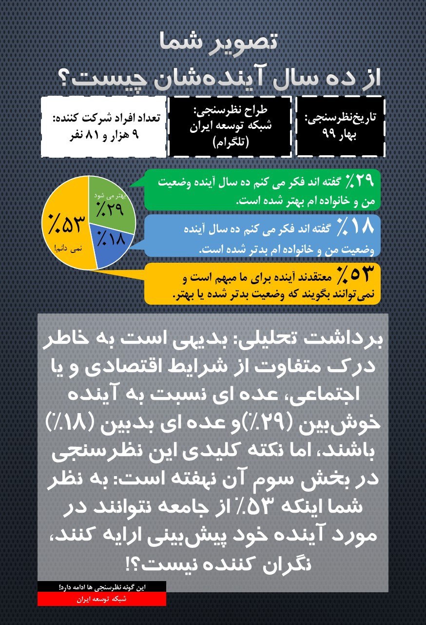 اخیرا در نظرسنجی  «شبکه توسعه» در خصوص تصور ایرانیان از ده سال آینده‌شان پرسش شده است؛ و ۹۰۸۱ نفر در این نظرسنجی شرکت کرده‌اند. از میان آنان ۲۹٪ باور دارند که وضعیت‌شان بهتر می‌شود و ۱۸٪ گفته‌اند بدتر؛ خب ممکن است این سوال را بپرسید که بقیه چه گفتند؟